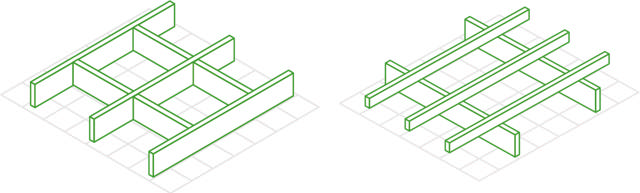 Valik sõltub sageli terrassi kõrgusest. Ristkarkassi (paremal) saab üldjuhul kiiremini paigaldada, aga selle jaoks peab terrassilaudis jääma veidi kõrgemale. Juhul kui terrass sh terrassi karkass peab olema madalam, langeb valik tavaliselt tasapinnalise karkassi kasuks (vasakul), kus prussid ja kandetalad ristuvad samal kõrgusel.