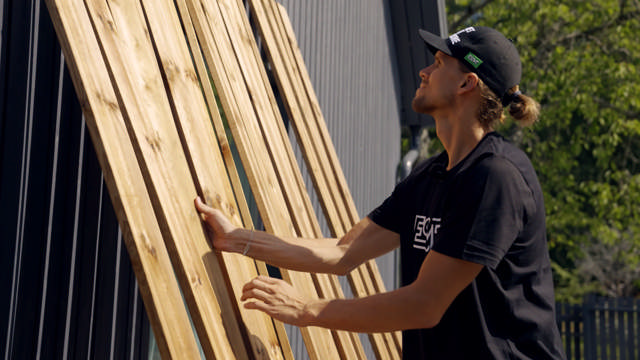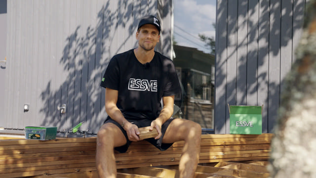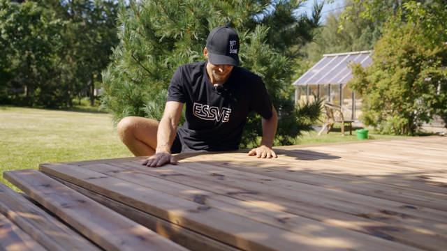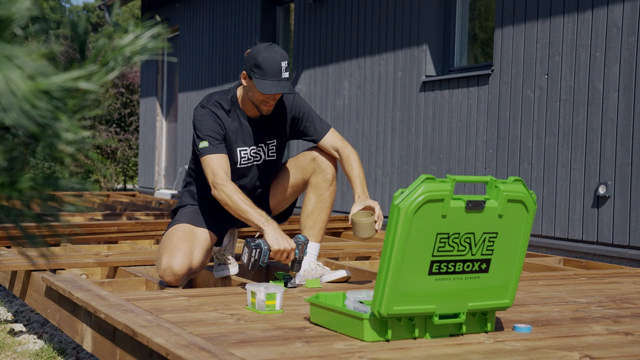 Terrassilaudade paigaldamiseks kasutas Kristjan ESSVE HDS roostevabu kruve, mis võimaldavad terrassilaudu kinnitada külgedelt diagonaalis, ilma et kruvipead jääksid näha. Selline „nähtamatu” kinnitusviis loob puhta ja viimistletud välimuse, mis oli Kristjani jaoks oluline. Kruvide kinnitamisel kasutas ta uut ESSVE HDS PRO paigaldusrakist, mis võimaldas tööd teha kiiresti ja täpselt, isegi üksinda tegutsedes. Rakis tagas iga laua puhul nii stabiilsuse kui ka korrektse kinnitussügavuse. Lauavahedeks jättis Kristjan umbes 3–4 mm, kasutades selleks ESSVE spetsiaalseid distantsklotse, mis on uue rakisega kaasas.