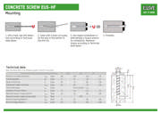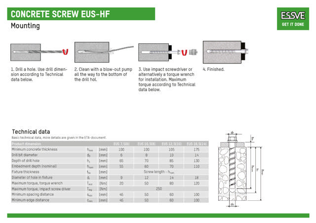 ESSVE betoonikruvid EUS on kõrge kvaliteediga betoonikruvid, mis on mõeldud paigaldustöödeks, kus soovitakse tagada paigaldustöö suurt turvalisust, nt piirete, kukkumiskaitsevarustuse, valuvormide, raketisevarraste jne puhul. Kruvidel on CE-märgis ETA hinnangu (valik 1) alusel, mis annab neile heakskiidu paigaldustöödeks nii pragudeta kui ka pragudega betoonis.