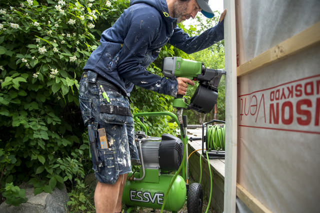 - Att montera med spikpistol går snabbt. För snyggast resultat tipsar snickare vi arbetar med om att ställa in slagdjupet på spikpistolen så att du behöver handslå en sista gång med hammare. Detta på grund av att det finns risk att kratrar skapas i virket om du monterar med spikpistol - något som undviks om du ställer in ett slagdjupet och handslår sista vägen.