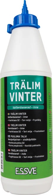 Trälim VINTER är ett vattenbaserat vitlim för allroundbruk. För bästa resultat ska material som ska limmas ha god passform och ytan helst vara nybearbetad. Limförband sätts i press under minst trettio minuter, gärna längre. Blir transparent efter torkning. Kan förvaras och användas kallt ned till -10°C, men bäst frostfritt. Ej torkat lim rengöres med vatten eller ESSVE RENGÖRING DUKAR.